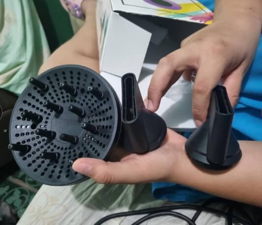 El TurboFlow viene con cinco cabezales: una boquilla de concentración de aire, un difusor para rizos, un cabezal para cabello fino y uso diario y un accesorio para cabello encrespado. Estos accesorios permiten un secado y peinado personalizado para diferentes tipos de cabello y estilos.